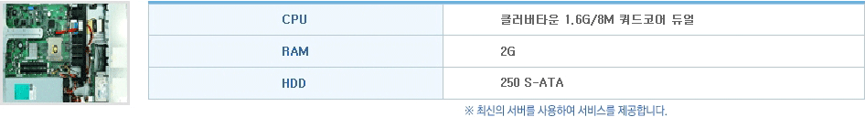 기본사양은 클러버타운 1.6G/8M 쿼드코어 듀얼 CPU, 2G RAM, 250 S-ATA HDD입니다. 여기에 서버의 특성에